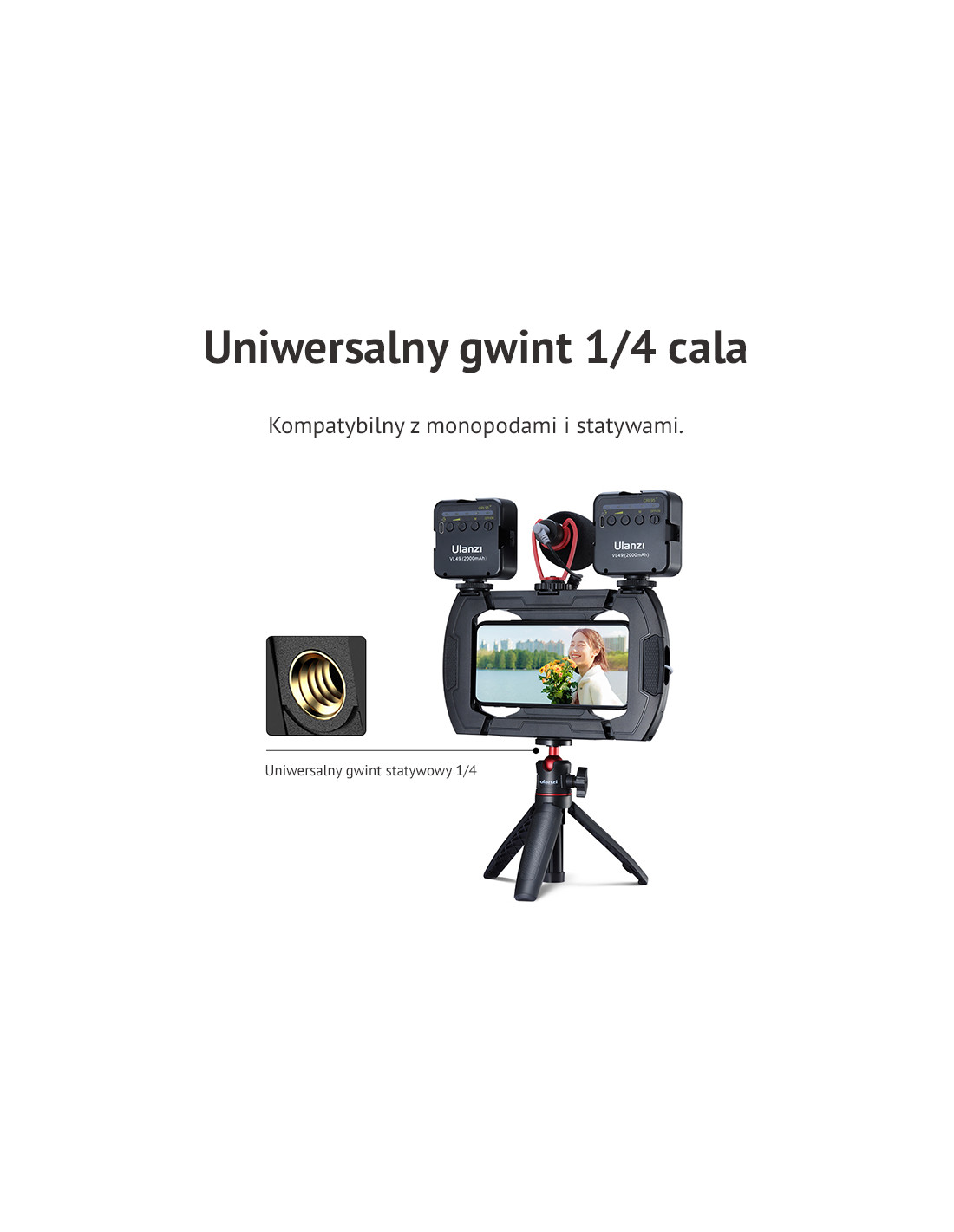 Dzięki mocowaniu na standardowy gwint 1/4 cala zamontujesz go na gimbalu, statywie lub kijku do selfie.