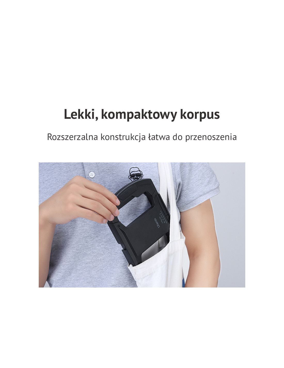 W zestawie jest regulowany pasek na rękę, który ułatwia przenoszenie.